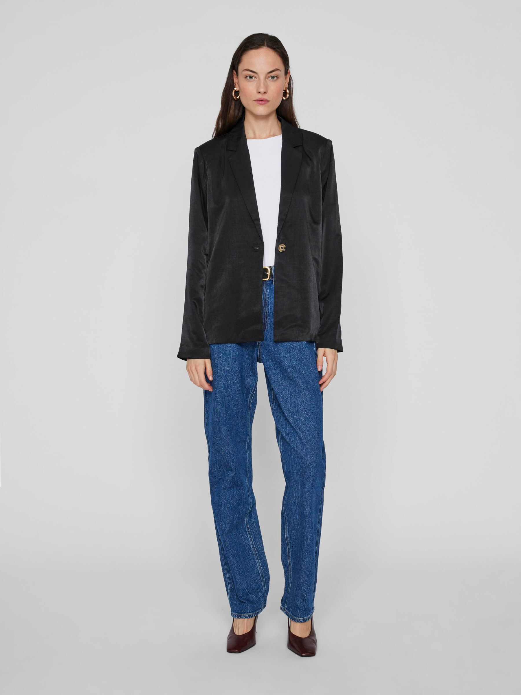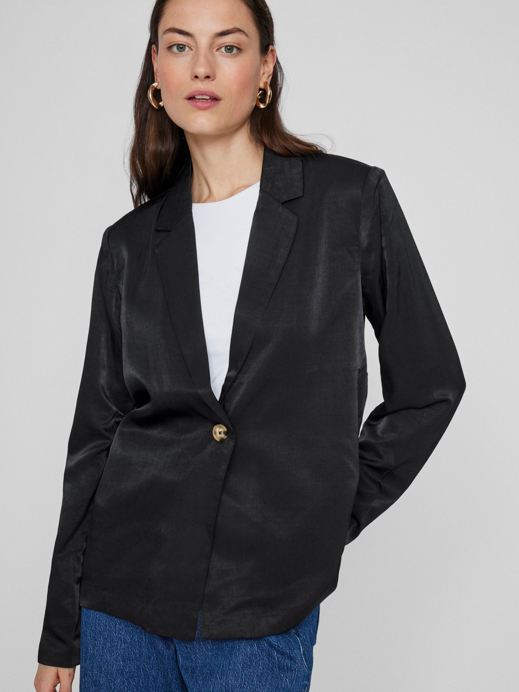 • Classic, single-breasted blazer• Padded shoulders• Shiny fabric• Regular fit• Length: 68 cm in size 38• Sleeve length: 65 cm in size 38
