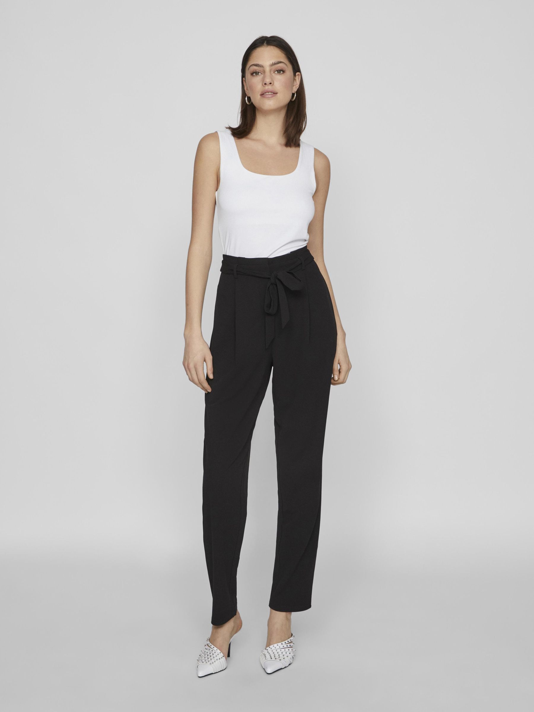 • Belted pants• High waist• Zip-up fly with hook and button fastening• Side pockets• Straight fit• Inseam: 78 cm in size M• Frontrise: 32 cm in size M